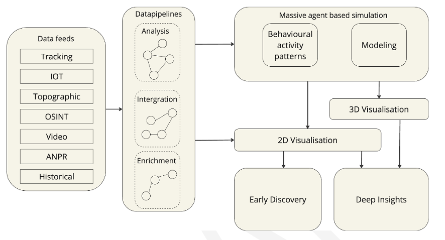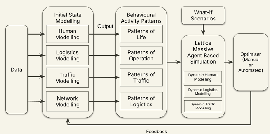 The foundations of simulation technology are the pairing of massive scale agent-based models with a technology called Behavioral Activity Patterns, which combines the behaviors of people and systems into a single simulation. By running “what-if” scenarios, customer teams can explore scenarios, visualising how traffic bottlenecks might threaten personnel safety, how disruptions could weaken the supply chain, or how early indicators of civil unrest could jeopardise community, staff and facilities.
